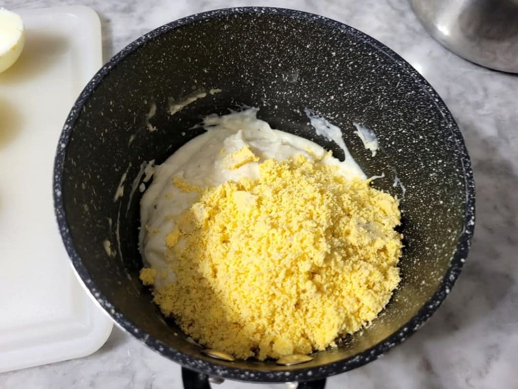 Füllen Sie alle hartgekochten Eiweiße mit der Mischung aus Béchamel und Eigelb