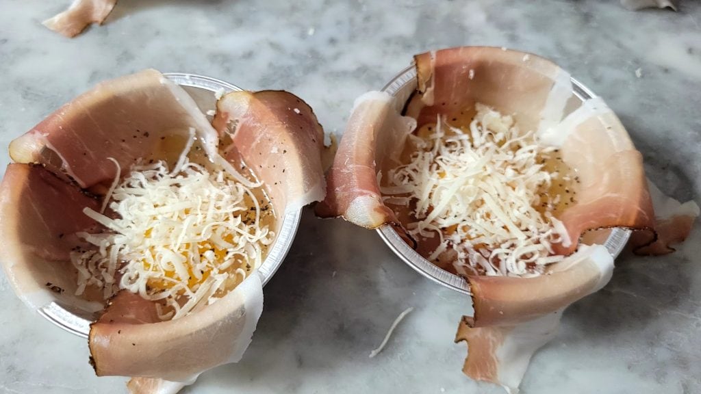 Den Speck zu einem Päckchen schließen und die Förmchen auf den Rost der Heißluftfritteuse stellen