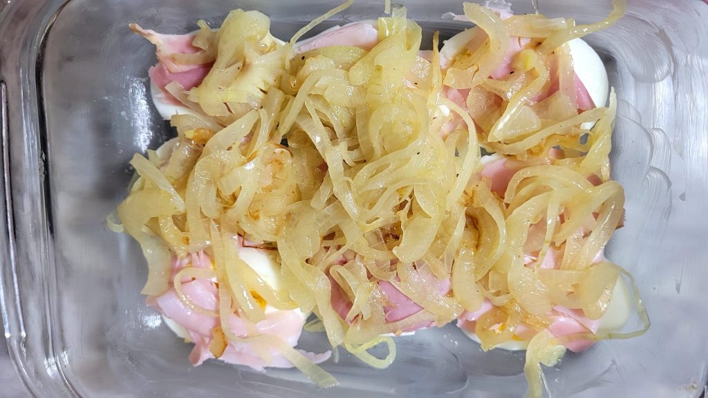 Für das Eiergratin in der Heißluftfritteuse habe ich auch die Eier in der Heißluftfritteuse gekocht, aber wenn Sie möchten, verwenden Sie die traditionelle Methode. Ich habe diese Eier mit einer mit Salbei aromatisierten Zwiebel, geräuchertem Kochschinken, Sahne und Parmesan angereichert.