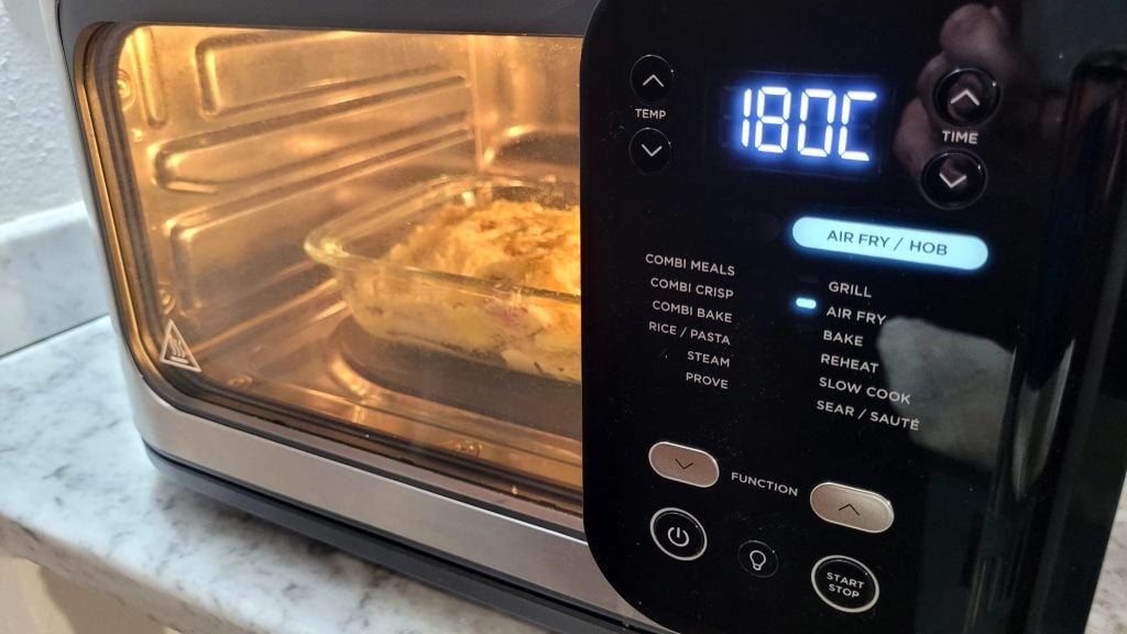 Stellen Sie die Form in die Heißluftfritteuse und backen Sie sie bei 180° für 9 Minuten oder bis die Oberfläche goldbraun ist