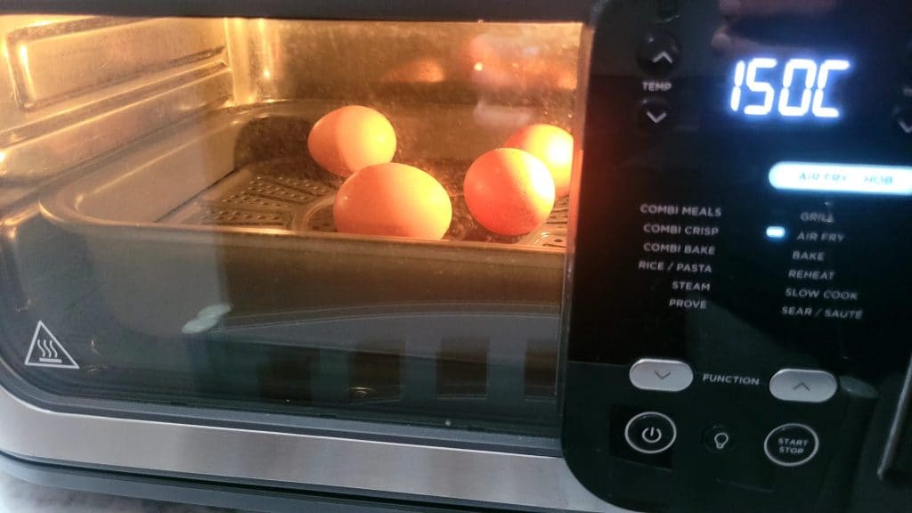 Hart gekochte Eier in der Heißluftfritteuse zuzubereiten ist sehr einfach: Legen Sie die Eier einfach direkt auf den Rost und stellen Sie Grad und Zeit ein. Normalerweise kochen diejenigen, die hart gekochte Eier in der Heißluftfritteuse zubereiten, sie bei 130° für 15 Minuten, ich habe sie bei 150° für 13 Minuten gekocht, weil meine Fritteuse die Mindesttemperatur auf 150° eingestellt hat, passen Sie sich Ihrer Fritteuse an. Sobald sie fertig sind, lassen Sie sie ein paar Minuten abkühlen und entfernen Sie die Schale.
