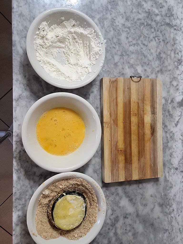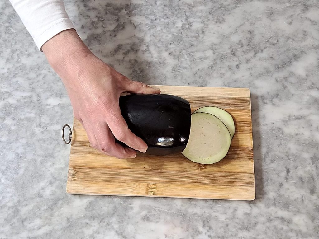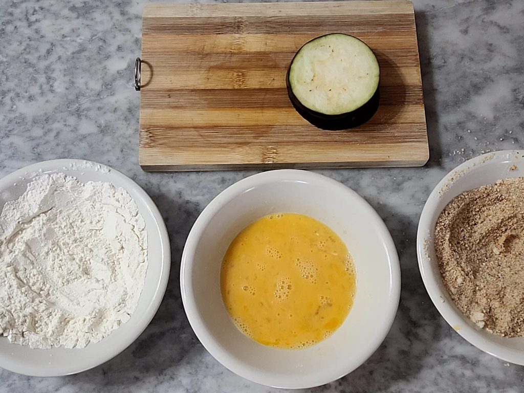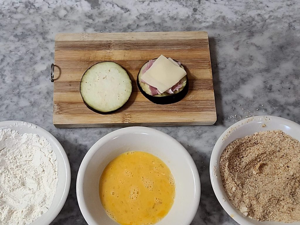 Um die gefüllten Auberginenschnitzel in der Heißluftfritteuse zuzubereiten, müssen die Auberginen gleichmäßig dick geschnitten, mit Salz bestreut, um ihr Pflanzenwasser und den bitteren Geschmack zu verlieren, gefüllt und paniert werden. Sobald sie fertig sind, mit Öl besprühen und zum Garen übergehen. Für die Füllung habe ich gekochten Schinken und Scheibenkäse verwendet, es passen hervorragend Scamorza, Edamer oder Provola, sowohl mild als auch geräuchert, je nach Geschmack.