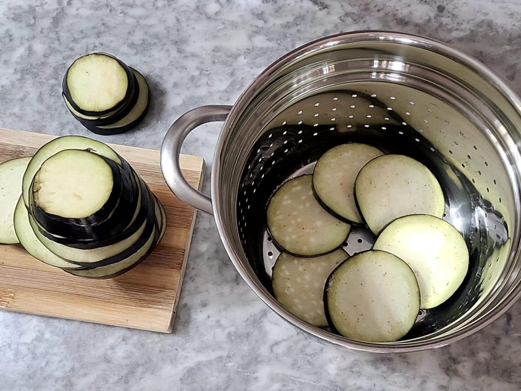 Nehmen Sie ein Sieb und legen Sie eine erste Schicht Auberginen ein und bestreuen Sie sie mit grobem Salz. Fahren Sie so fort, bis alle Auberginen aufgebraucht sind. Lassen Sie sie so etwa 30 Minuten ruhen. Auf diese Weise verlieren die Auberginen ihr Pflanzenwasser und den bitteren Geschmack.
