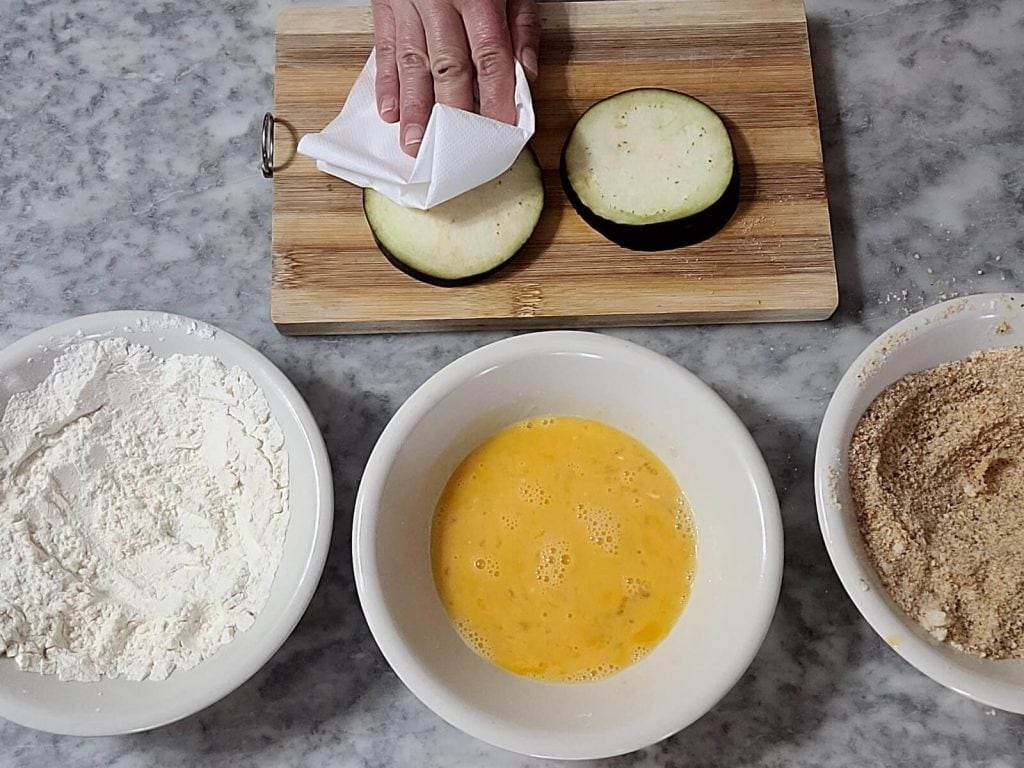 Und schließlich in Semmelbrösel, dabei leicht drücken, damit sie gut an beiden Seiten und um die Auberginen haften