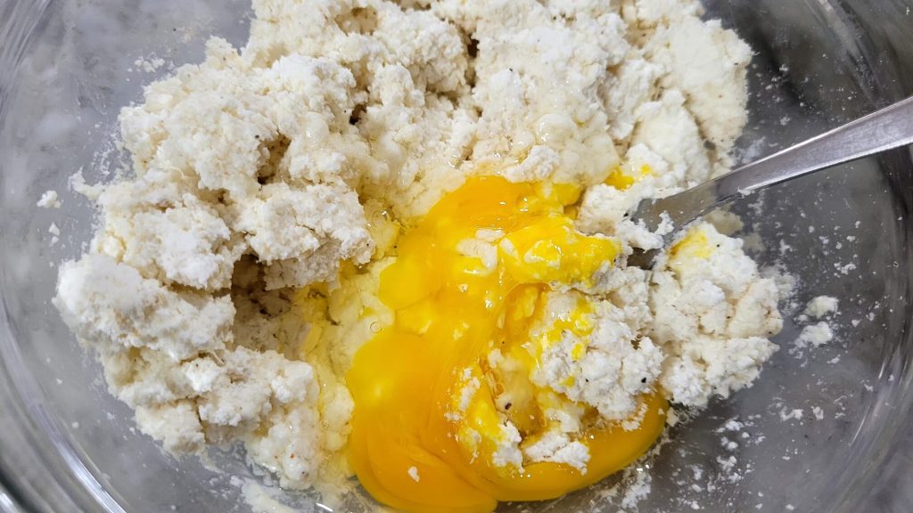 In einer anderen Schüssel das Ei, den geriebenen Grana, das geschlagene Ei, den Pfeffer, das Salz und die Muskatnuss gut vermengen