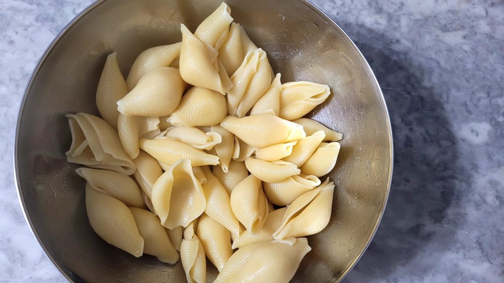 Kochen Sie die Conchiglioni in reichlich gesalzenem Wasser, und lassen Sie sie zwei Minuten vor der auf der Packung angegebenen Zeit abtropfen. Denken Sie daran, das Kochwasser für die Pecorino-Sauce aufzuheben. Lassen Sie sie abtropfen und geben Sie sie in eine Schüssel mit etwas Olivenöl, um zu verhindern, dass sie aneinander kleben