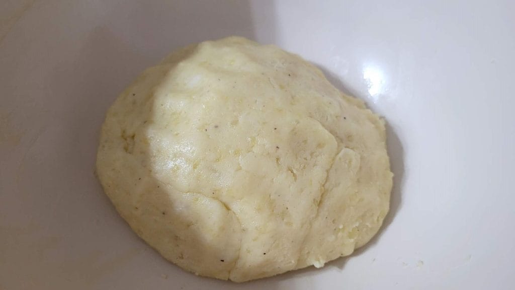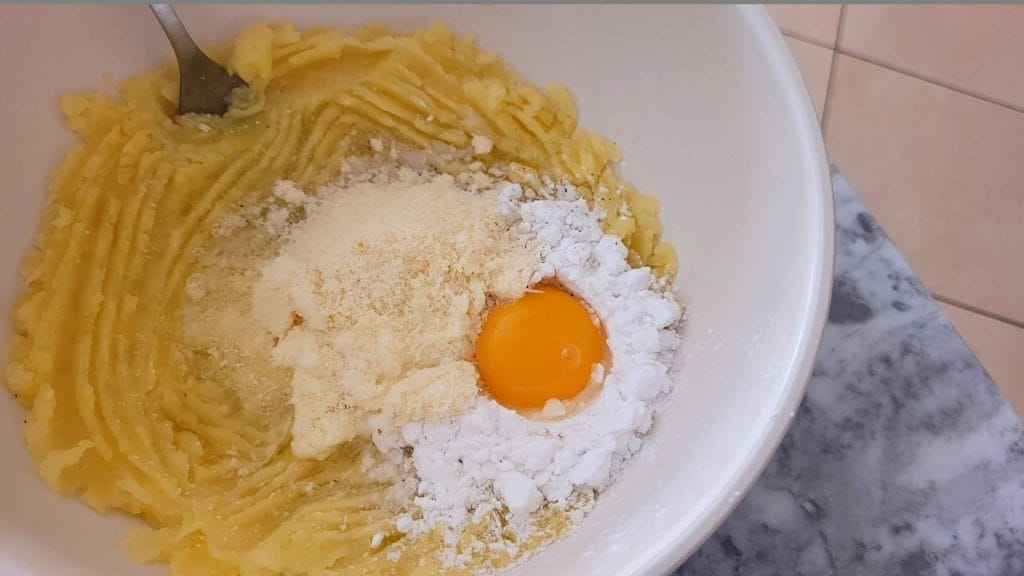 In eine Schüssel geben und mit einer Gabel oder einem Kartoffelstampfer zerdrücken. Etwas abkühlen lassen und Kartoffelstärke, Hefe, Salz, Pfeffer, Ei hinzufügen und kneten.