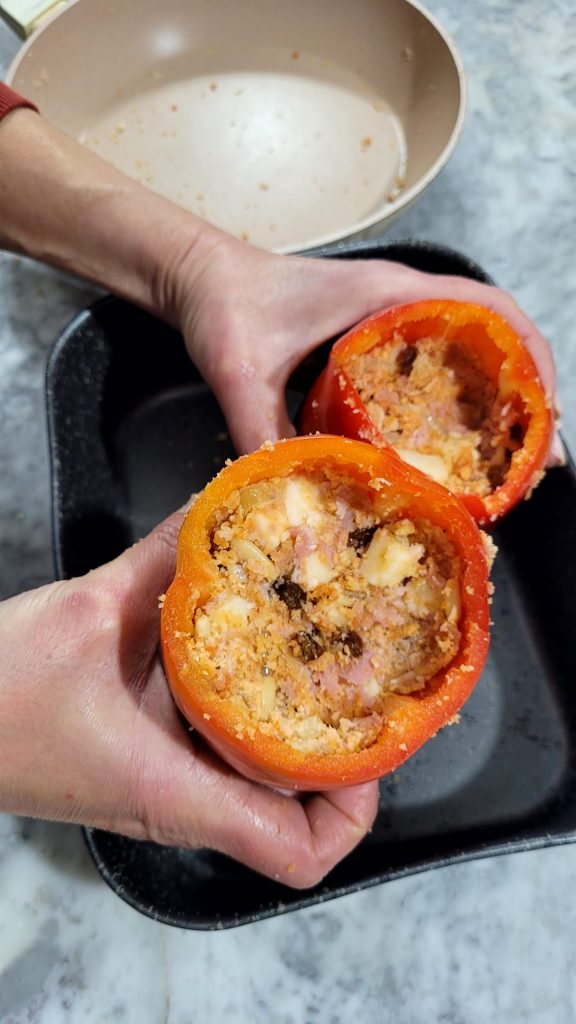Die Zwiebel, in etwas extra nativem Olivenöl angeröstet, gibt der Füllung Duft und Tiefe – genau wie meine Mama es mir gezeigt hat. Nachdem die Paprika gefüllt sind, werden sie in der Heißluftfritteuse gegart: in wenigen Minuten sind sie durch, zart, aber noch bissfest, behalten ihren Geschmack und sind dabei nicht schwer.