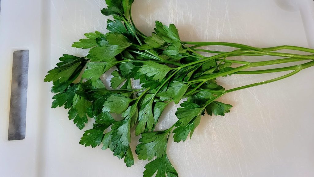 • Waschen, trocknen Sie einen Büschel Petersilie und hacken Sie ihn mit einem Messer