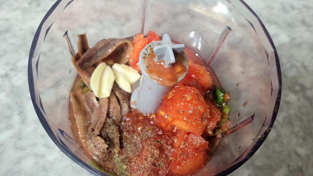 Geben Sie das Fleisch aller Tomaten in den Mixer zusammen mit den anderen Zutaten: Sardellen, Kapern, Basilikumblätter, Knoblauchzehe, eine Prise Salz und Pfeffer