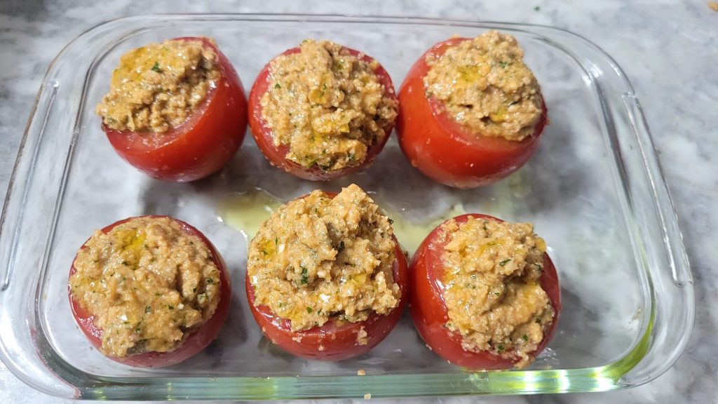 Die Füllung wird sehr schnell zubereitet, indem das Tomatenfleisch zusammen mit Sardellen, Kapern, Pecorino, altbackenem Brot und Basilikum püriert wird, eine Mischung aus Geschmack und Frische