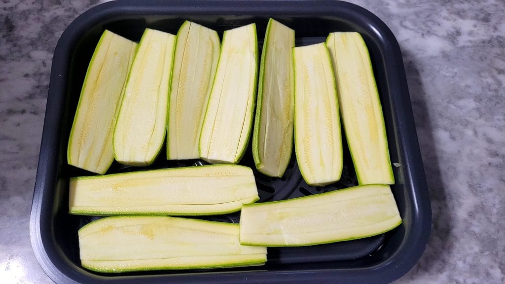 Ich habe sie in meiner Ninja Combi 12 in 1 gegart, die ein Multikocher ist und eine Heißluftfritteuse mit Dampfgarfunktion. Ich habe zwei Tassen Wasser in das Blech mit dem Air-Fry-Gitter gegeben, auf dem ich die geschnittenen Zucchini platziert habe.