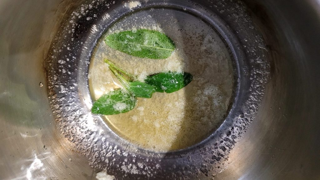 • In der Zwischenzeit 25 g Butter mit Salbei (optional) in einem kleinen Topf schmelzen