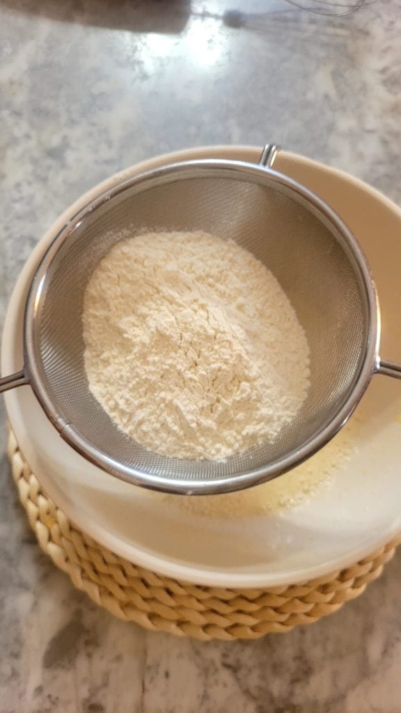 • Das gesiebte Mehl und Backpulver zur Mischung geben und etwa 5 Minuten verarbeiten