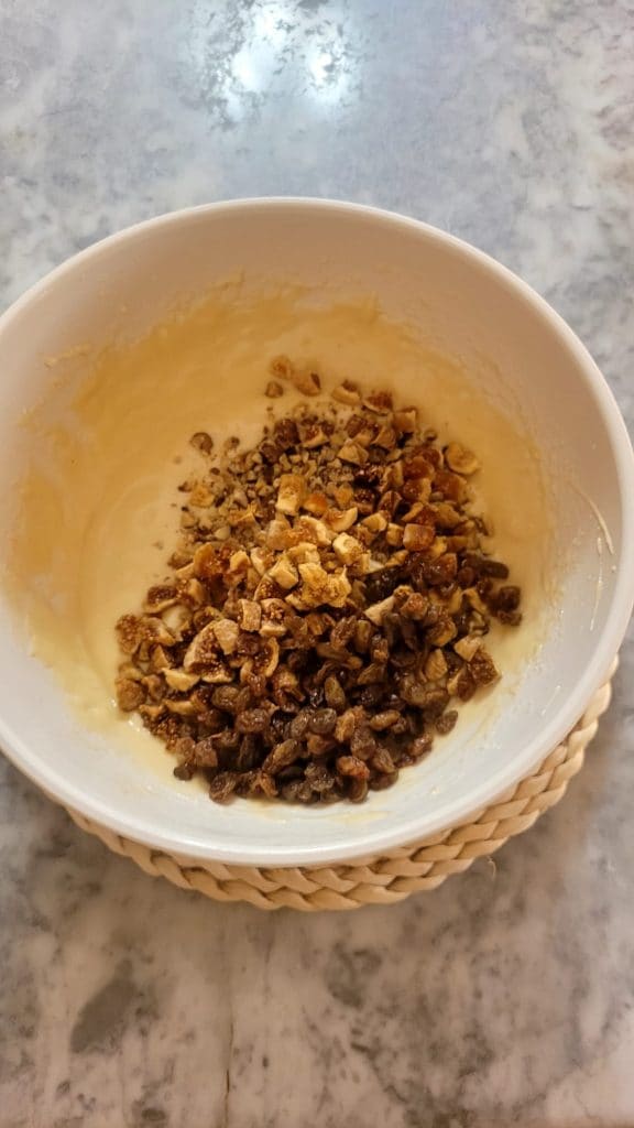 • Die gut abgetropften Rosinen, gewürfelten Feigen und gehackten Walnüsse hinzufügen