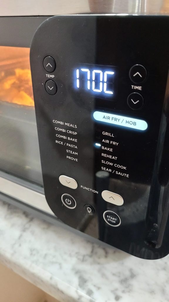 Heizen Sie die Friggitrice mit dem Programm ‚Backen‘ oder ‚Air Fry‘ auf 170° für 2/3 Minuten vor. Setzen Sie die Form auf den Rost oder das Tablett und backen Sie den Kuchen für 23 Minuten.