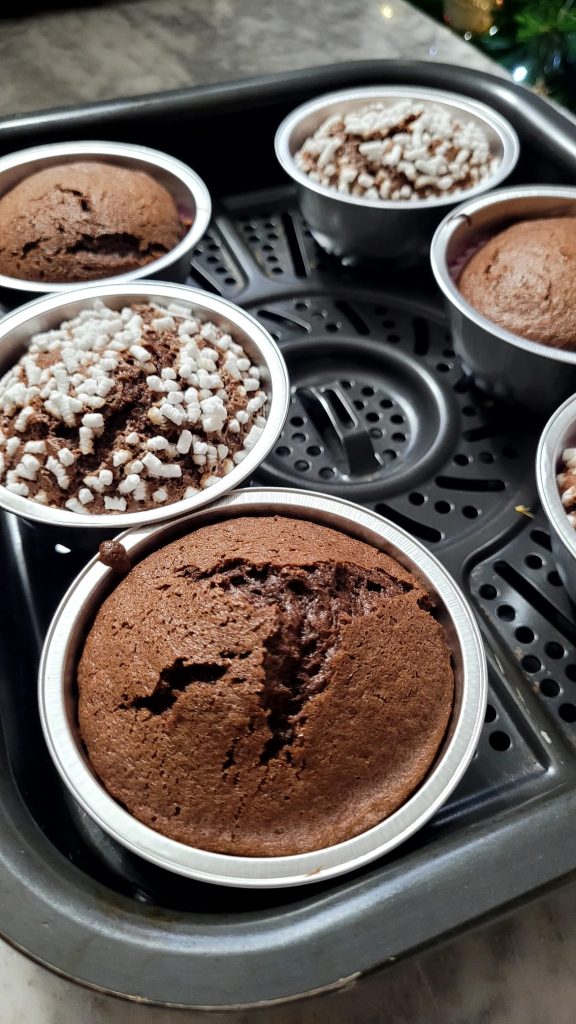 Geben Sie den Zuckerstreusel auf die Oberfläche (optional). Heizen Sie die Heißluftfritteuse 2/3 Minuten auf 170°C vor und legen Sie die Förmchen auf das Gitter oder Tablett