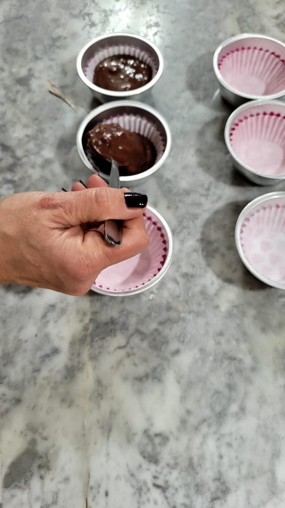Legen Sie die Papierbackförmchen in die Aluminiumförmchen. Verwenden Sie einen Löffel, um den Teig einzufüllen, ohne bis zum Rand zu kommen, sondern lassen Sie etwas Platz.