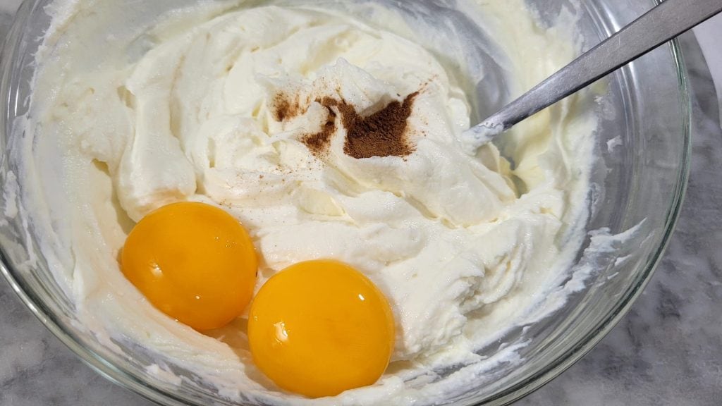 Fügen Sie die Eigelbe und den Zimt (optional) hinzu und verarbeiten Sie die Mischung weiter, bis sie glatt und klumpenfrei ist. Stellen Sie sie im Kühlschrank bis zur Verwendung zur Füllung des Mürbeteigs