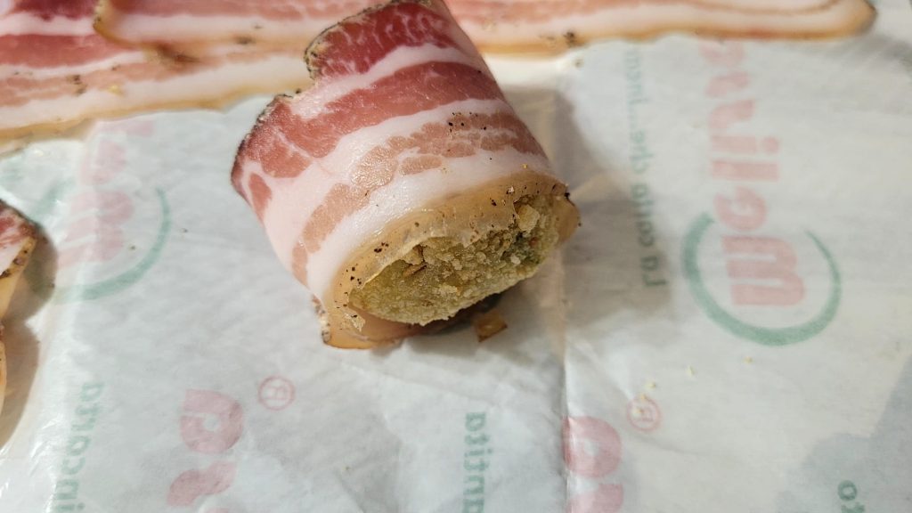 • Wickelt nun die Kugel in eine Scheibe Speck. Verwendet eine Scheibe für jede Kugel