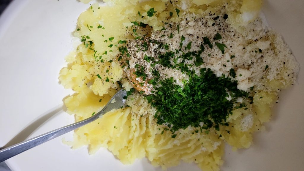 • Nachdem ihr die Kartoffeln gekocht oder gedämpft habt, zerdrückt sie mit einer Gabel und lasst sie 10 Minuten abkühlen. Sobald sie abgekühlt sind, könnt ihr den Grana, das Ei, die gehackte Petersilie, das Salz und den Pfeffer hinzufügen