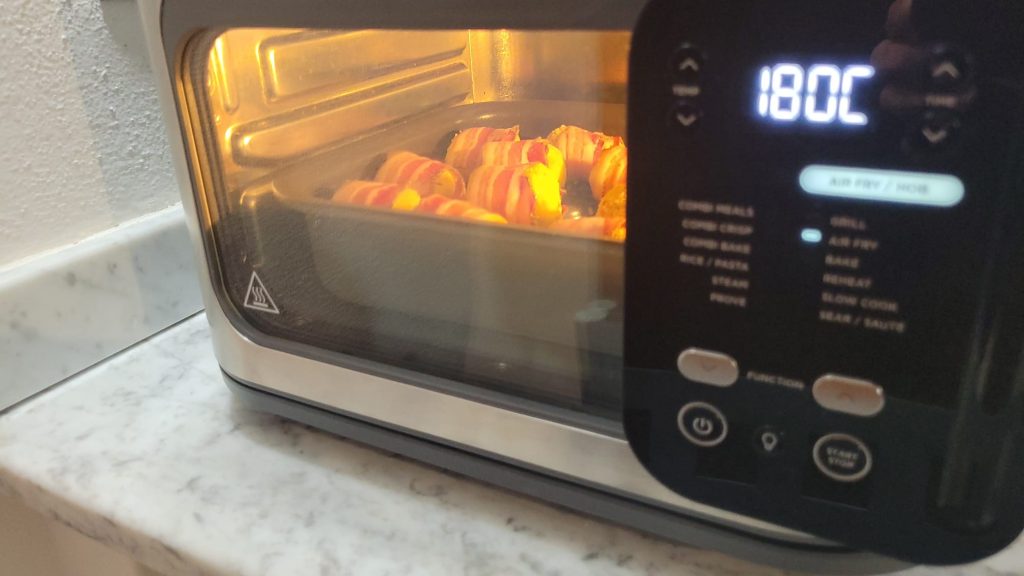 • Legt sie nach und nach auf das Gitter eurer Heißluftfritteuse, während ihr sie in den Speck wickelt