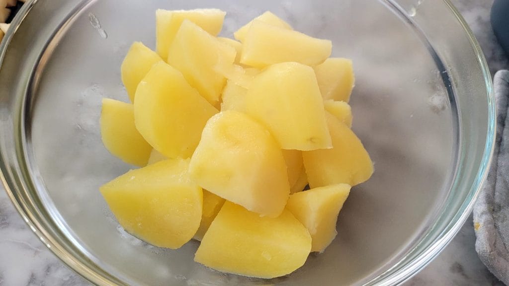 • Kochen Sie die Kartoffeln mit der Methode, die Sie bevorzugen und zur Verfügung haben. Ich habe sie mit dem Dampfgarmodus in 10 Minuten in meinem Ninja gekocht