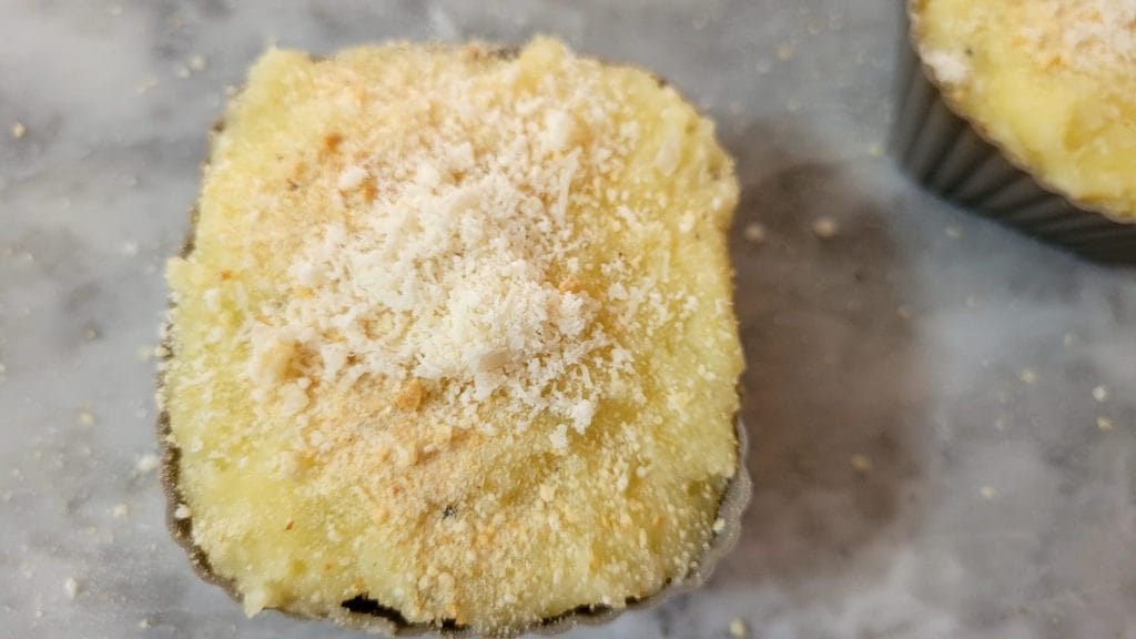 • Mit weiterer Kartoffelmasse bedecken und die Oberfläche mit etwas Paniermehl und Grana bestreuen