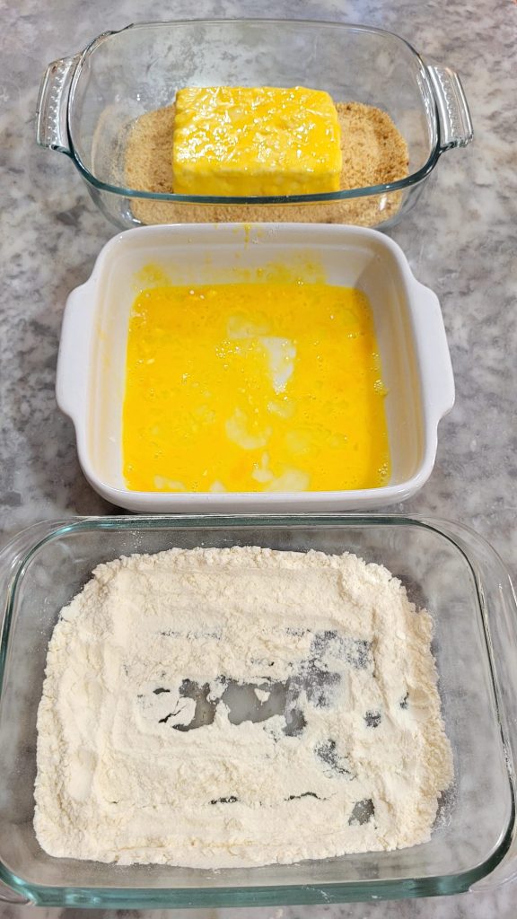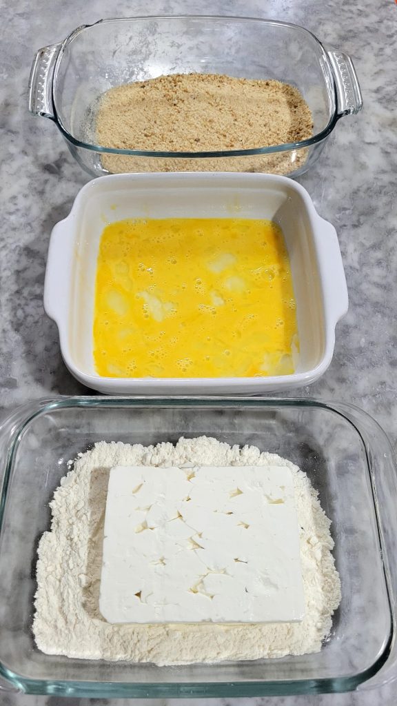 Jede Feta-Scheibe zuerst im Mehl wenden,