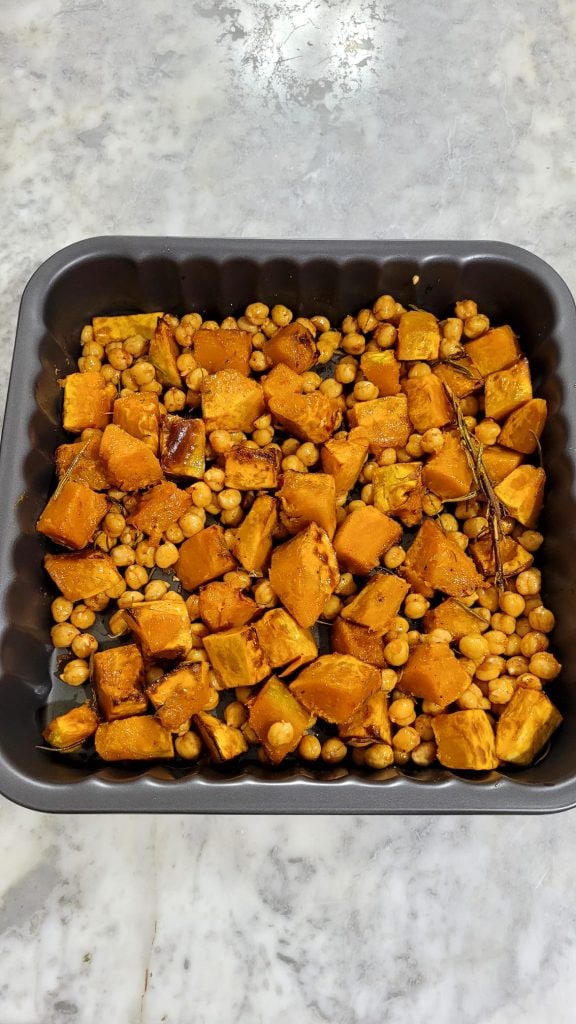 Entfernen Sie die Knoblauchzehen, würzen Sie bei Bedarf mit Salz und Pfeffer und servieren Sie Ihre knusprigen Kürbis und Kichererbsen!