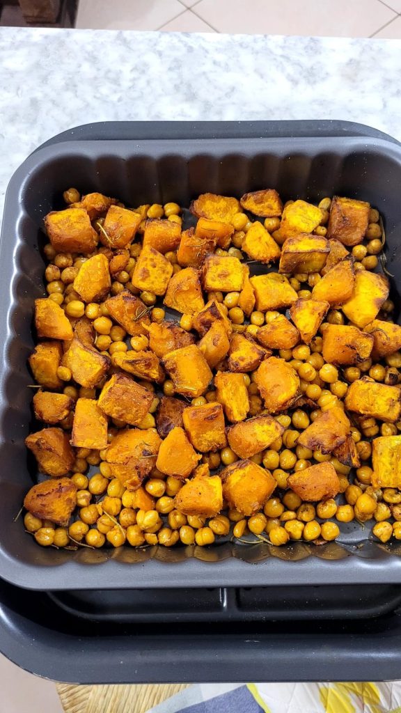 Stellen Sie das Blech wieder in die Heißluftfritteuse auf den Rost und setzen Sie das Garen bei 200° für 9/10 Minuten fort. Der Kürbis sollte weich, aber fest sein und eine leichte Kruste auf der Oberfläche haben, auch die Kichererbsen sollten leicht knusprig sein. Mischen Sie ein paar Mal während des Garens
