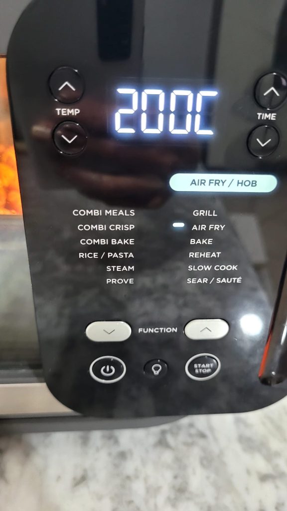 Stellen Sie das Blech auf den Rost der Heißluftfritteuse und garen Sie, mit dem Air-Fry-Programm bei 200° für 7 Minuten, mischen Sie während des Garens