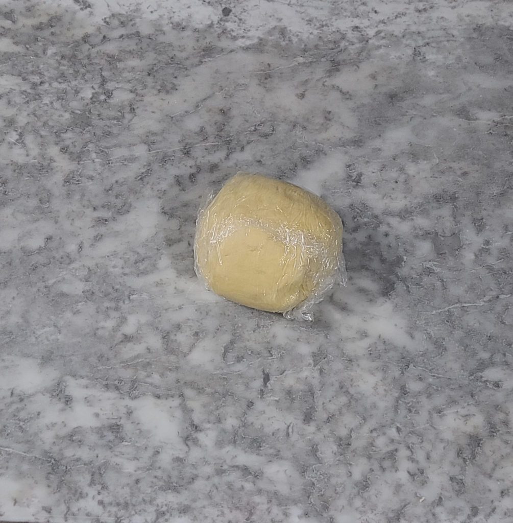 Den Teig in Frischhaltefolie wickeln und mindestens eine halbe Stunde in den Kühlschrank legen.
