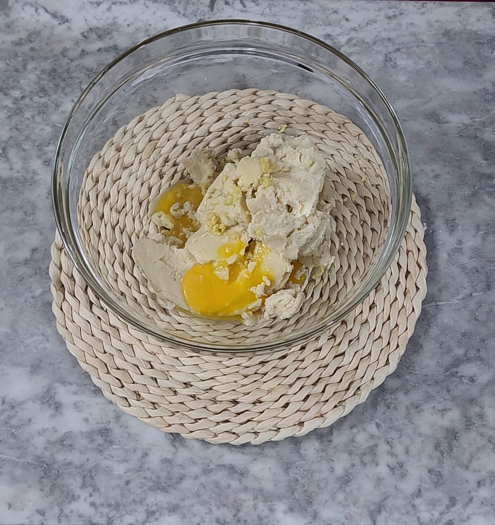 Eigelb, geriebene Zitronenschale und eine Prise Salz hinzufügen. Den Teig von Hand zu einem glatten Kloß verarbeiten.