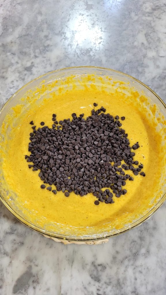 • Fügen Sie jetzt die Schokoladentropfen hinzu und mischen Sie die Masse mit einer Spatel oder einem Löffel mit sanften Bewegungen.