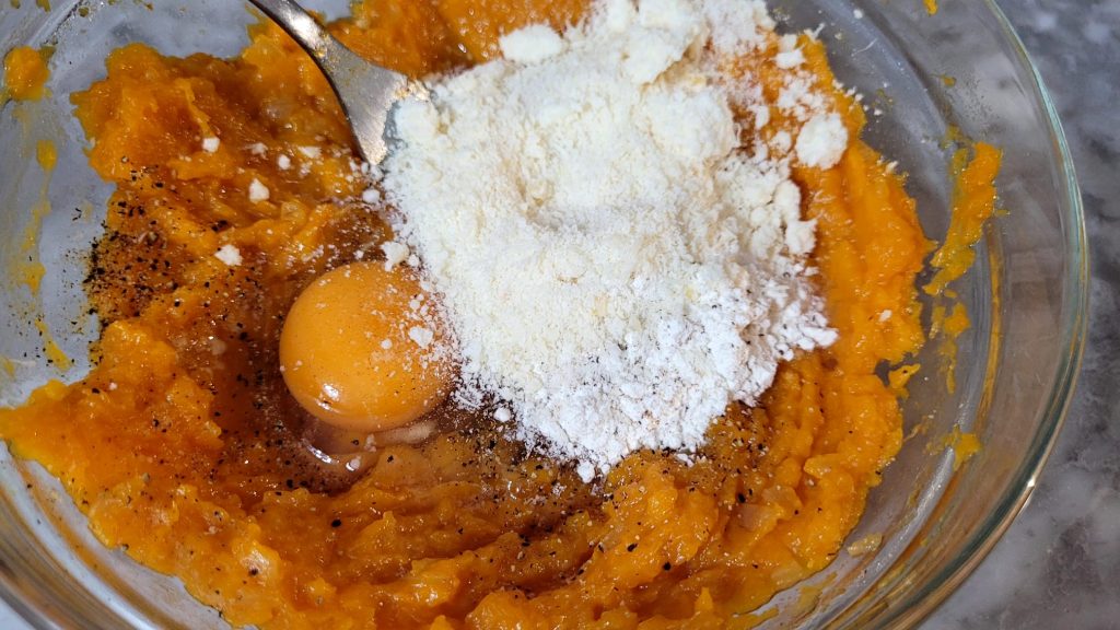 Fügen Sie das Ei, das Mehl, den geriebenen Parmesan, Salz, Pfeffer und Muskatnuss hinzu und mischen Sie alles gut
