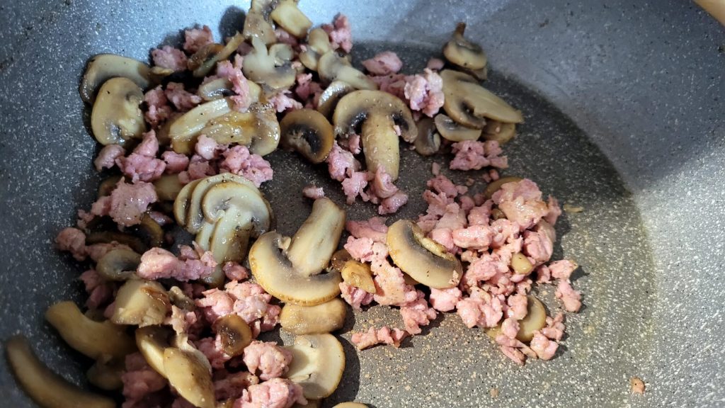 Bröckeln Sie sie grob und geben Sie sie in die gleiche heiße Pfanne, in der Sie die Pilze gekocht haben, und zerbröckeln Sie sie so gut wie möglich mit einem Löffel oder einem Holzspatel. Braten Sie sie für ein paar Minuten an