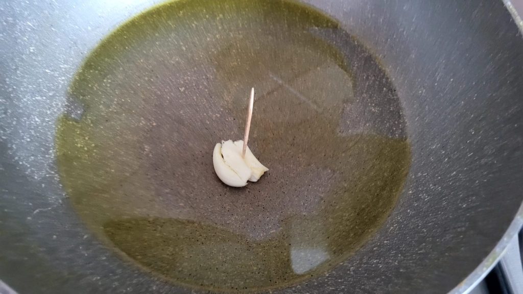 Schälen Sie den Knoblauch und braten Sie ihn in extra nativem Olivenöl an