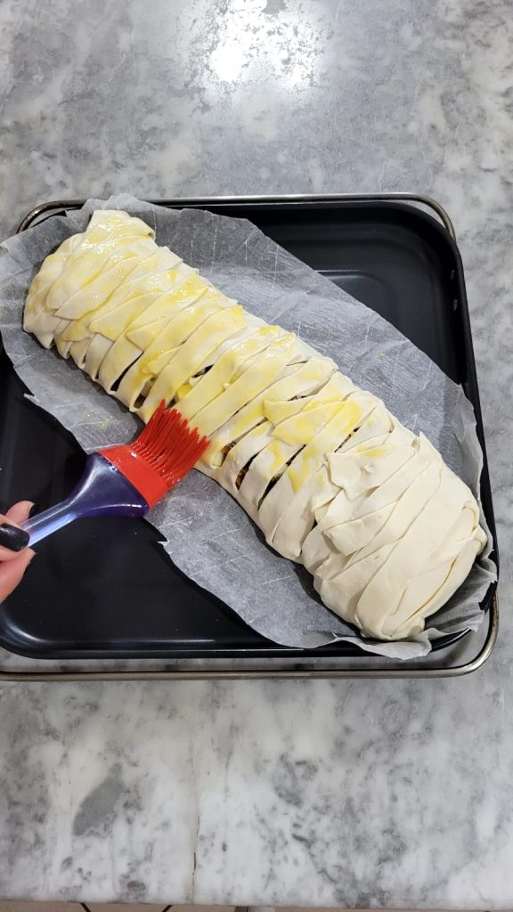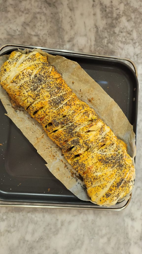 Wenn Sie Platzprobleme haben, weil Sie eine kleine Heißluftfritteuse besitzen, können Sie das Blätterteigsheet halbieren und zwei Strudel machen, in diesem Fall müssen Sie zweimal backen