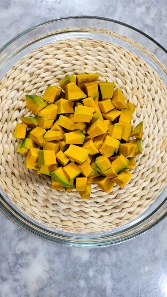 Nachdem Sie den Kürbis von Schale und Kernen befreit haben, schneiden Sie ihn in Würfel und geben Sie ihn in eine Schüssel