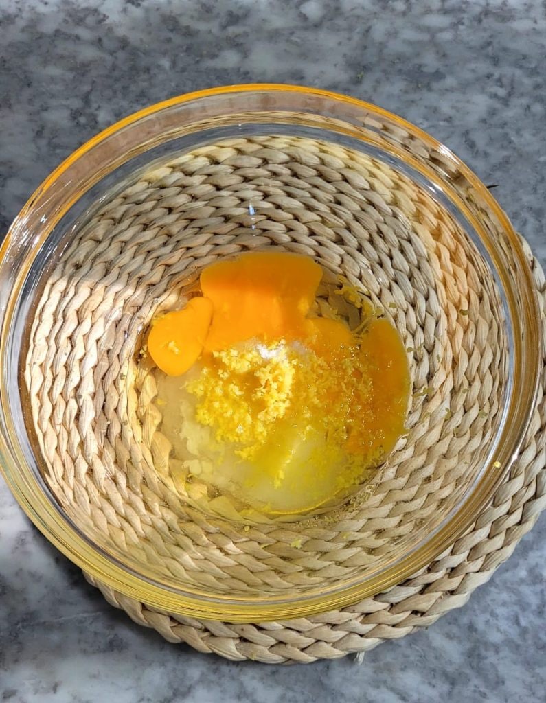 In einer anderen Schüssel Zucker, Eier, geriebene Zitronenschalen und eine Prise Salz mit dem elektrischen Schneebesen schlagen. Das Pflanzenöl langsam hinzufügen und noch einige Minuten weiterrühren