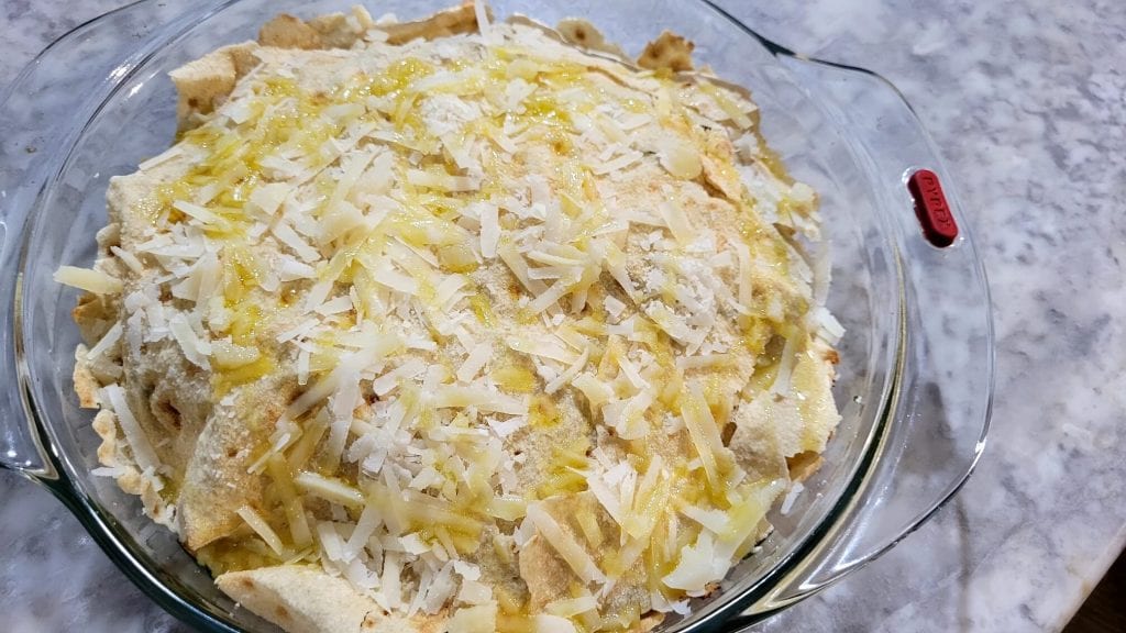 Fahren Sie mit den Schichten fort und beenden Sie mit dem Teigblatt und Pecorino. Beträufeln Sie es mit einem Schuss Öl