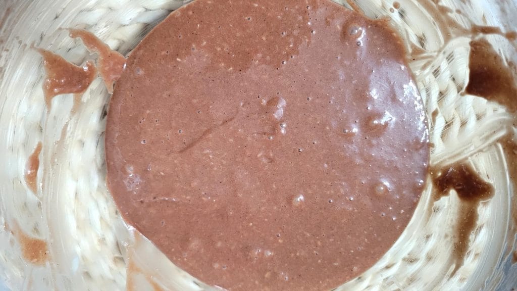 Gießen Sie die Hälfte des Teigs in eine andere Schüssel und fügen Sie den Kakao hinzu