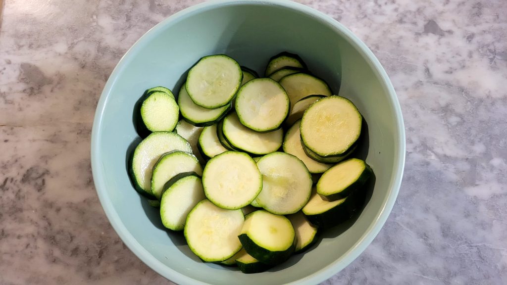 • Nachdem die Zucchini gewaschen und die Enden abgeschnitten wurden, schneidet sie in Scheiben und mischt sie in einer Schüssel mit 2 Esslöffeln Olivenöl extra vergine