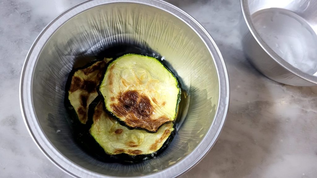 • Führt die Sequenz fort, bis ihr jeden Förmchenrand erreicht habt, und endet mit einer Schicht Zucchini
