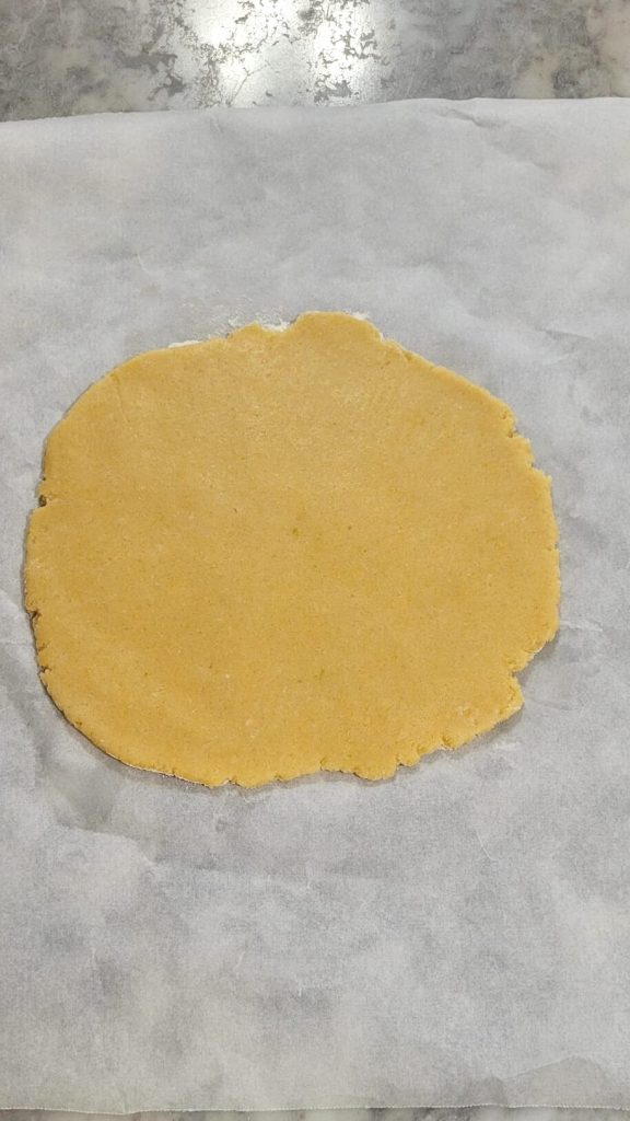 Nach dem Ruhen im Kühlschrank 3/4 des Teigs zwischen zwei leicht bemehlten Blättern Backpapier mit Hilfe eines Nudelholzes ausrollen und einen der beiden Teigkreise für den Kuchenboden formen