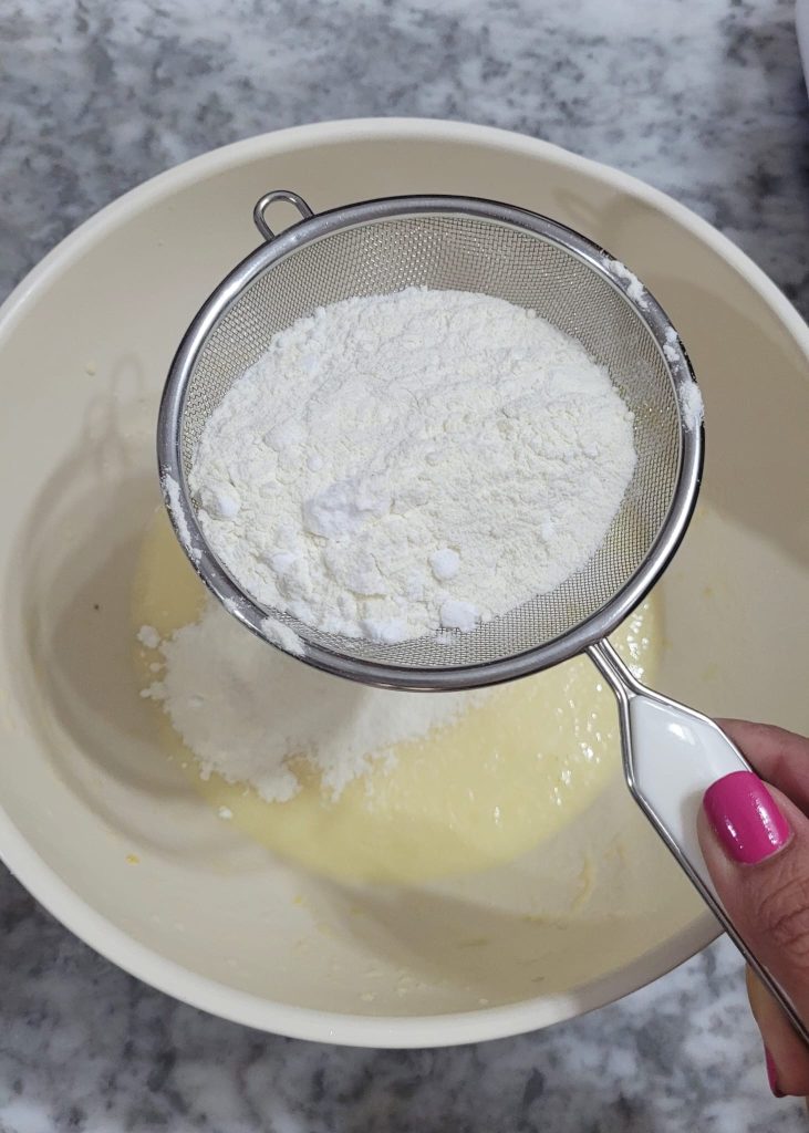 Jetzt fügen Sie das Mehl, das Vanillin, das gesiebte Backpulver und die Prise Salz hinzu