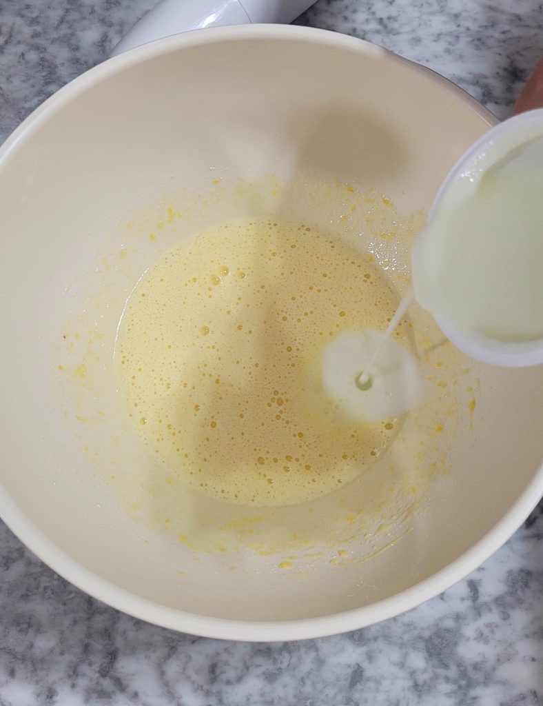 In einer großen Schüssel beginnen Sie, Zucker und Ei für 3/4 Minuten mit dem elektrischen Schneebesen zu schlagen
