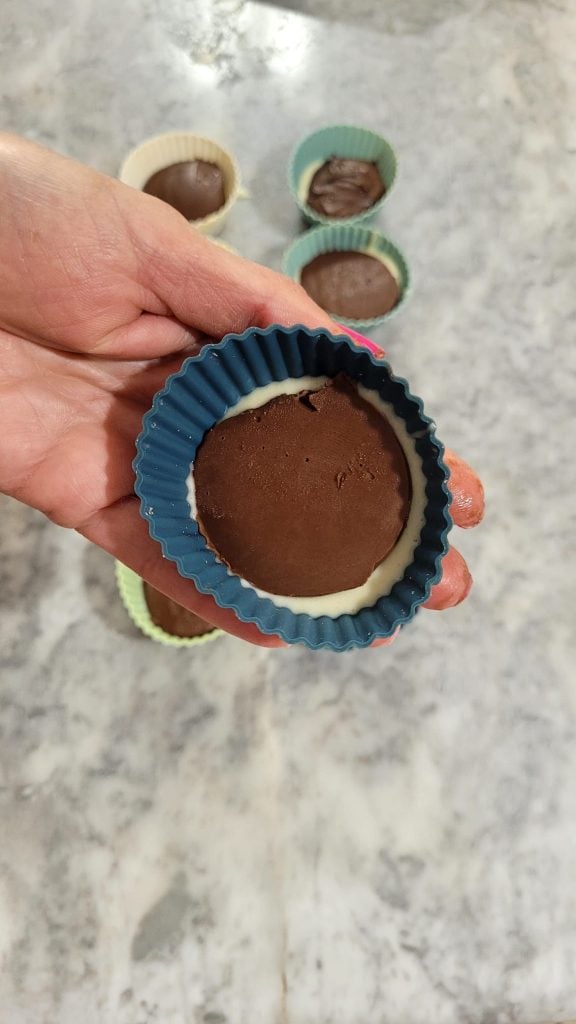 Die Eier und das Joghurt sollten Raumtemperatur haben, also nehmen Sie sie etwa eine halbe Stunde vor der Zubereitung aus dem Kühlschrank. Um das cremige Herz zu erzielen und zu verhindern, dass das Nutella beim Backen austrocknet, sollte es in den Gefrierschrank gelegt werden, bereits in Portionen entsprechend der Anzahl der Muffins aufgeteilt. Normalerweise reichen 15/20 Minuten, aber aufgrund der schrecklichen Hitze war es wirklich flüssig, also habe ich sie ein paar Minuten länger im Gefrierschrank gelassen.