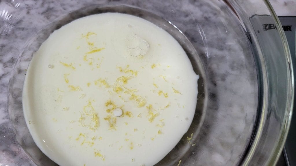 In einer anderen Schüssel mischen Sie die Flüssigkeiten und die Zitronenschale